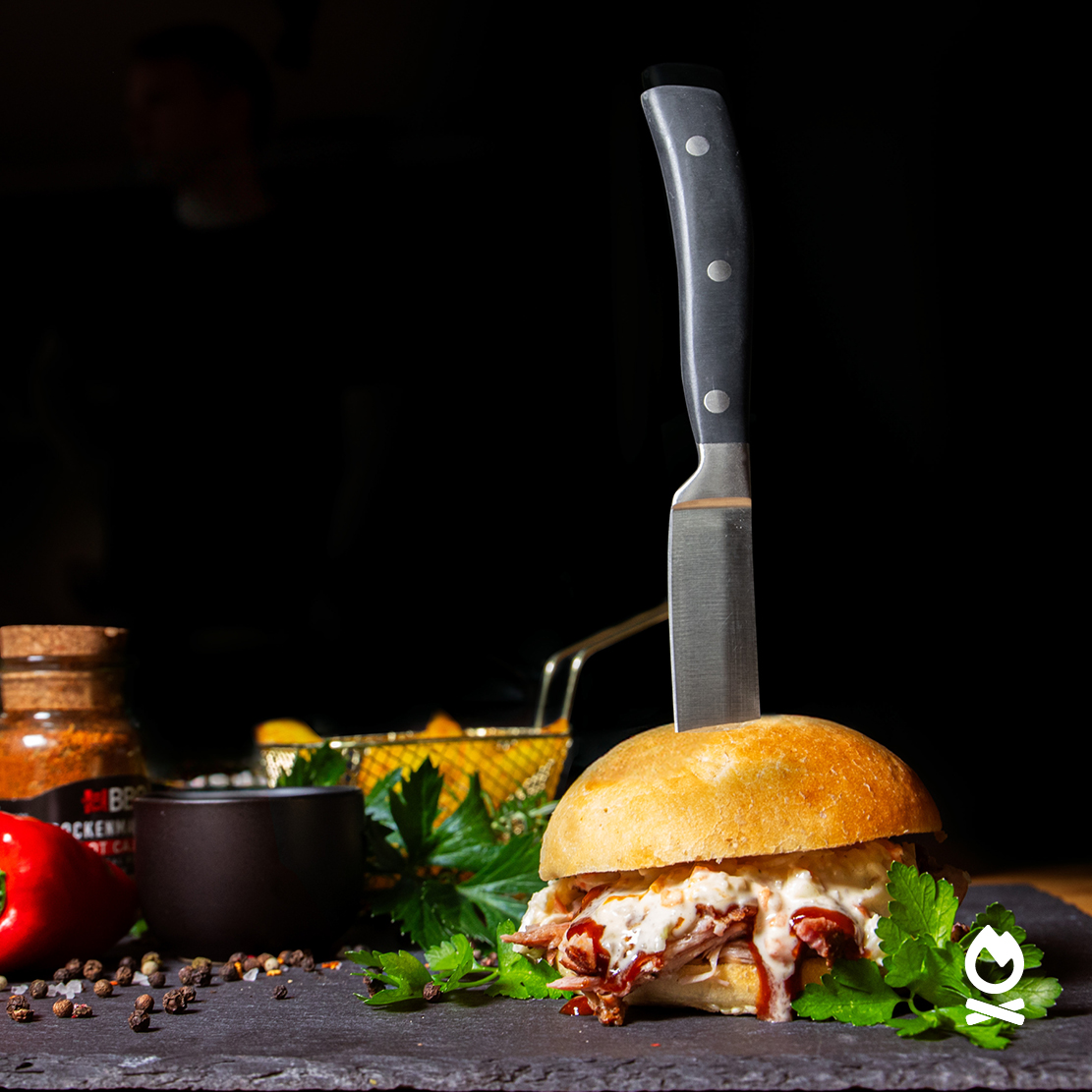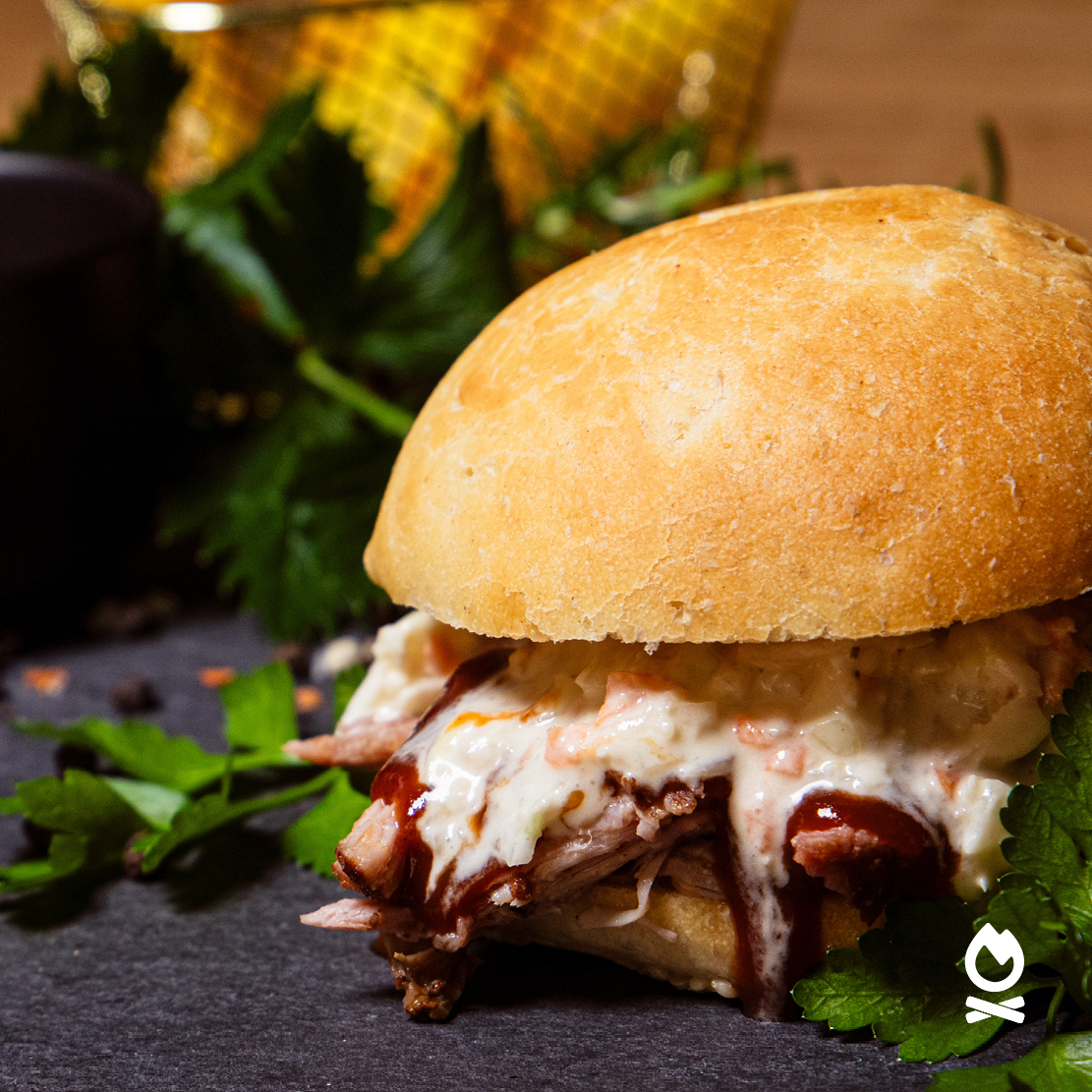 Der Schweinenacken wird mit Gewürzen verfeinert und über 6 Stunden lang auf dem Smoker zubereitet. Durch die lange Garzeit schmilzt das Fett im Inneren und das Fleisch wird so zart, dass man es mit den Händen zerupfen kann.